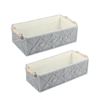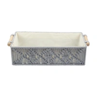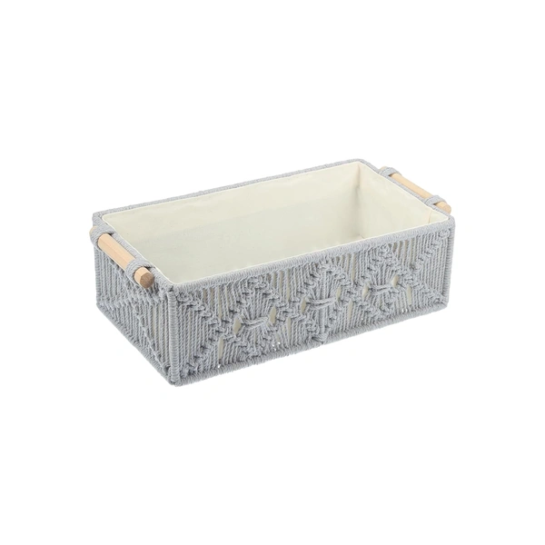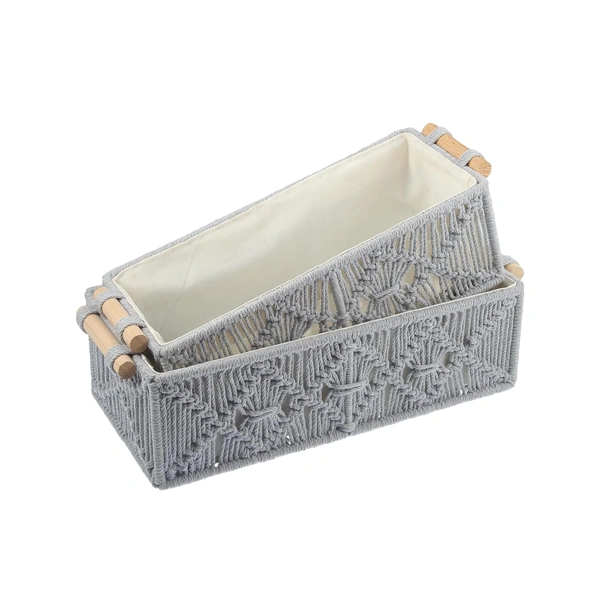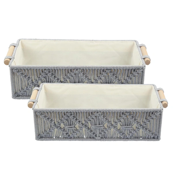 Macrame Storage Basket Handmade Cotton Storage Organizer with Wooden Handles, Durable Woven Decorative Basket for Home & Office, Crose Silver-(34x19x13 cm)- Pack of 2