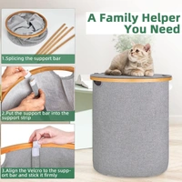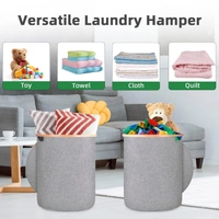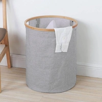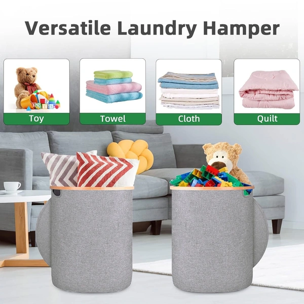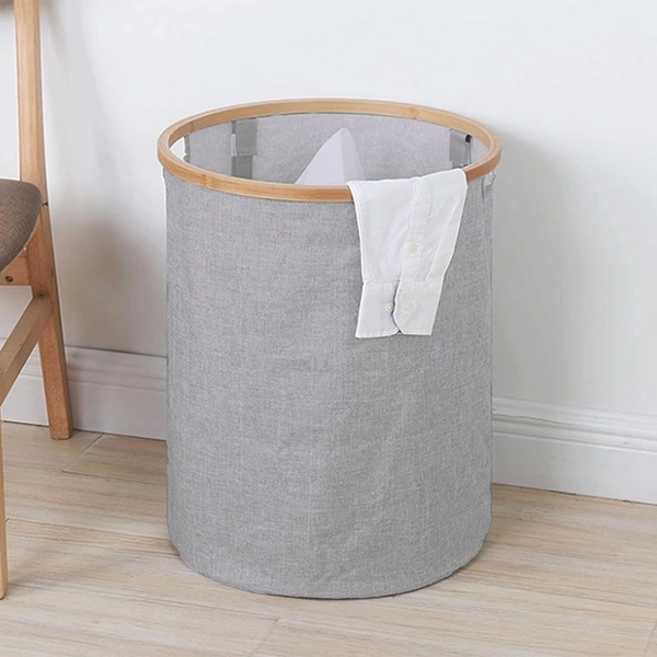 Round Fabric Storage Basket with Bamboo Handles - Durable Toy Organizer and Laundry Hamper - Collapsible Blue Storage Bin for Kids' Room, Nursery, and Home