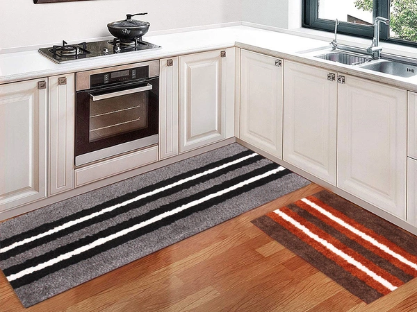 Runner Stripe Microfiber 1600 GSM Anti-Skid ( Grey, Terra , 58 Cm x 140 Cm + 38x58 Cm , Pack of 2 )